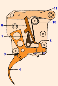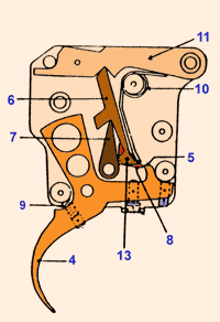 Нажатие на спусковой крючок (4) рассоединяет шептало спускового крючка (5) и верхний рычаг (6) , позволяя верхнему (6) и нижнему рычагу(7) "сложиться" (См. рис.2), шепталу (11) опуститься вниз, освобождая таким образом ударник.