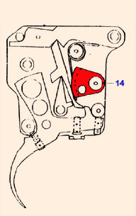 Предохранитель, при включении, поворачивает кулак (14), который отводит шептало верхнего рычага (Рис. 1) от шептала спускового крючка и блокирует движение деталей УСМ, лишь спусковой крючок может двигаться свободно. Кулак предохранителя удерживается во включенном и выключенном положении пружиной. Поворот кудака предохранителя осуществляется, в зависимости от исполнения, либо одним рычагом снизу, либо рычагом сверху, через систему тяг.